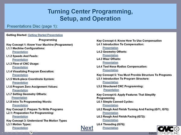 When the full course is purchased, this courseware includes everything your people need to learn CNC turning center programming setup, and operation - and it can be used over and over again to teach others in your company about CNC turning center usage.
